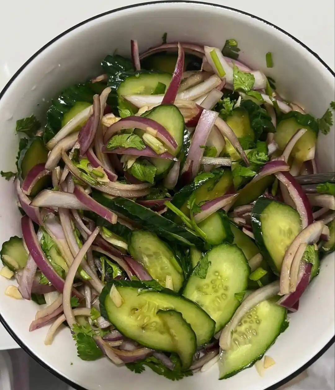 洋葱拌黄瓜是懒人快手凉菜。洋葱切丝泡水半小时,不然吃着特别辣眼睛。黄瓜用勺子刮掉皮,丝会更均匀。调料汁最重要,热油浇在蒜末和辣椒上滋滋响。白芝麻一定要熟的,生的吃着有股土味。拌匀后放冰箱十分钟更好吃。